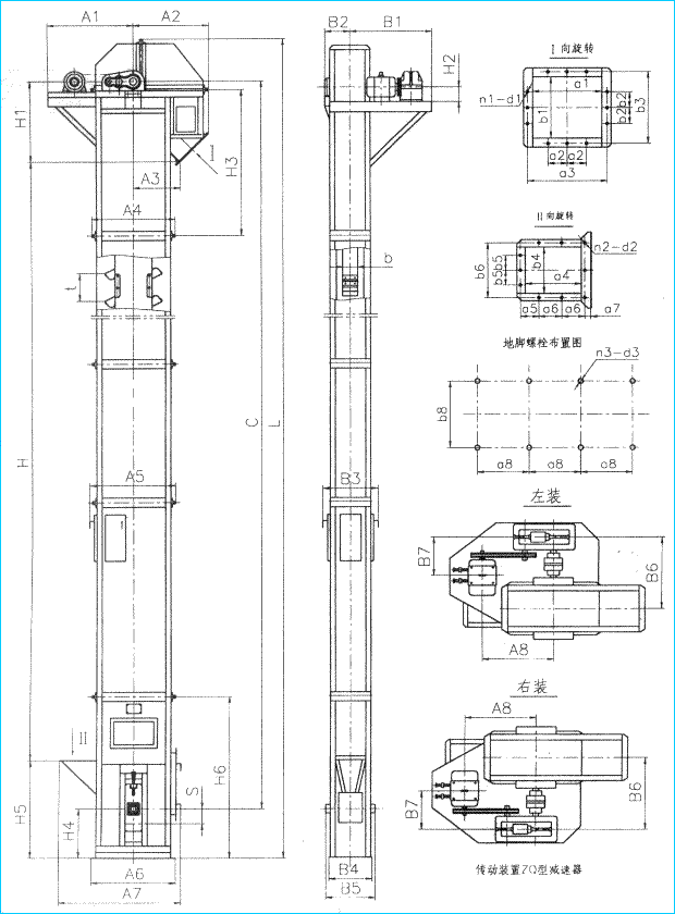 三、TH型斗式提升機(jī): TH型斗式提升機(jī)用于各種散狀物料的垂直輸送。適用于輸送粉狀、粒狀、小塊狀物料,物料溫度在250℃以下。 (一)TH型斗提機(jī)外形及安裝尺寸 TH型斗提機(jī)外形見圖2,其尺寸見表7、驅(qū)動裝置配套及相關(guān)尺寸見表9。 圖2 TH型斗提機(jī)外形圖