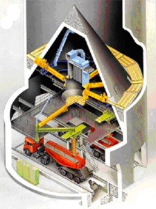 IBAU均化庫采用德國漢堡公司的連續(xù)均化技術(shù)。在外部帶一攪拌倉,庫底中心設(shè)一大圓錐,庫內(nèi)生料的重量通過該錐傳遞給庫壁,庫底環(huán)形空間被分成向中心傾斜10度的6個充氣區(qū),每區(qū)裝設(shè)3種規(guī)格的6個充氣箱。充氣卸料時生料先被送至一條徑向布置的充氣箱上,再經(jīng)過錐體下部的出料口由空氣斜槽送入庫底中央4000mm計(jì)量倉中。卸料時,生料在自上而下的流動過程中,切割水平料層而產(chǎn)生重力混合 作用,進(jìn)入攪拌倉后又連續(xù)充氣攪拌而得到進(jìn)一步均化,均化效果H可達(dá)6~8,電耗0.1~0.2Kwh/t生料。
